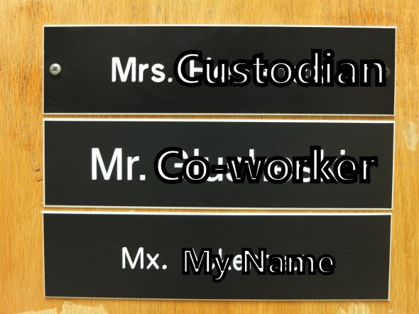 The short version is that I asked for the Mx. a year and 3 months ago, following my legal name change. A full year passed before anything happened, and it came through as Kameron [last name], which was not what I wanted. So I talked to the principal again, and luckily, she was pliable. A month ago, I saw a name plate in the admin. assistant’s trash (only because I empty her trash), that said, Ms. [last name]. Meaning, that Staples messed it up even though it got submitted the way I wanted it. Another week passed (during which time I was wondering if I’d have to check back in with the admin. assistant or not. Glad I just waited.) and, finally, there it was, on the custodial door.
